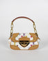 Crafted from white multicolour monogram coated canvas, the Marilyn bag features brass hardware and vachetta leather trim with a light patina. Gold-tone chain-link accents add a touch of elegance to the shoulder straps. The design includes a rear slip pocket, a burgundy Alcantara-lined interior with one internal pocket, and a front push-lock closure.